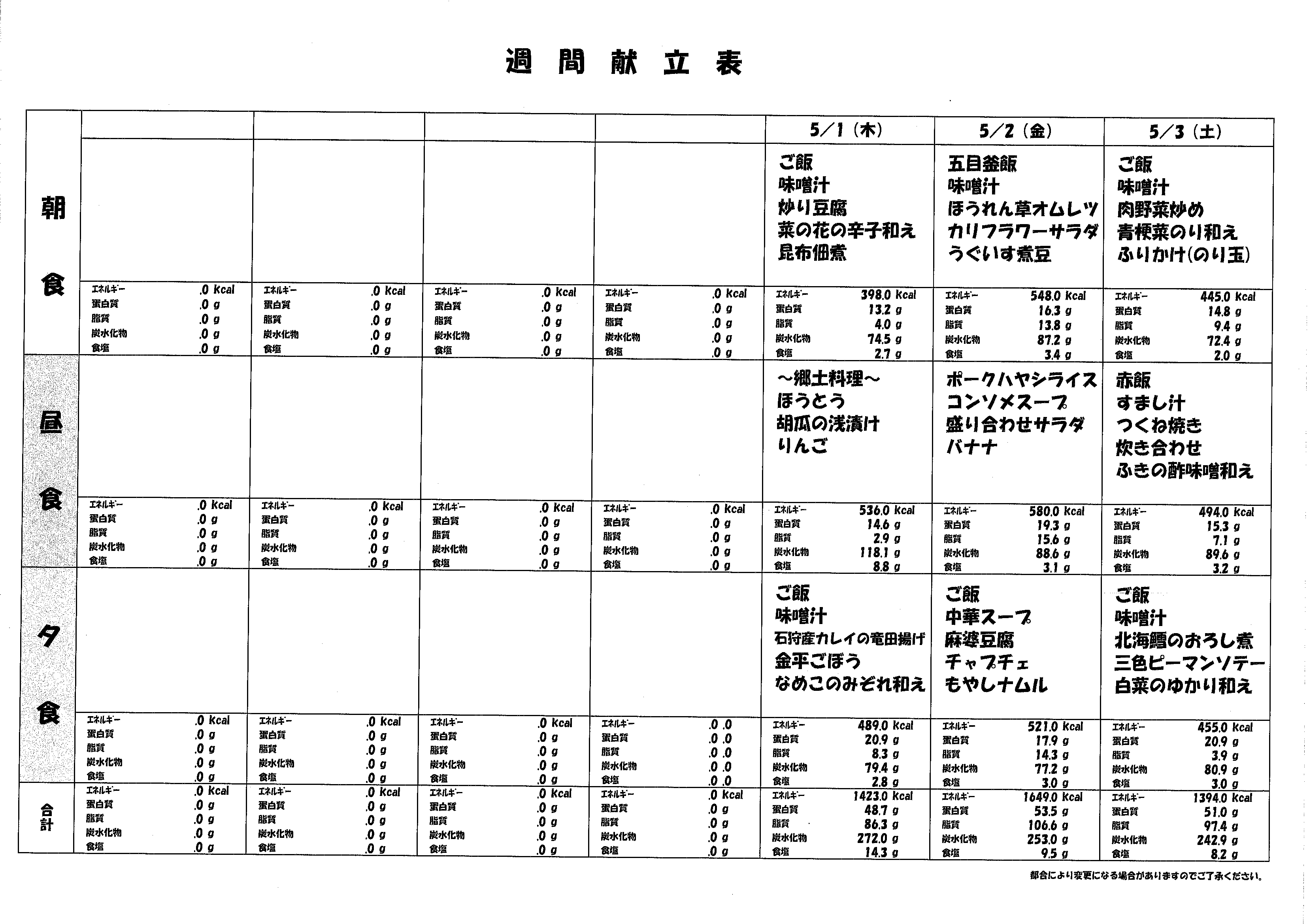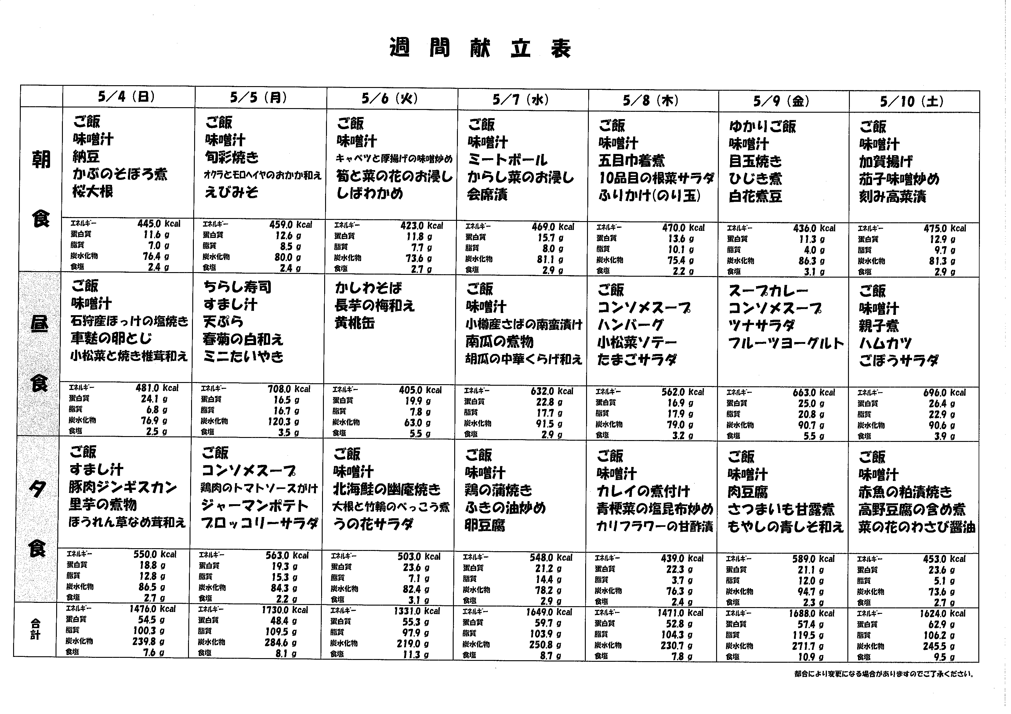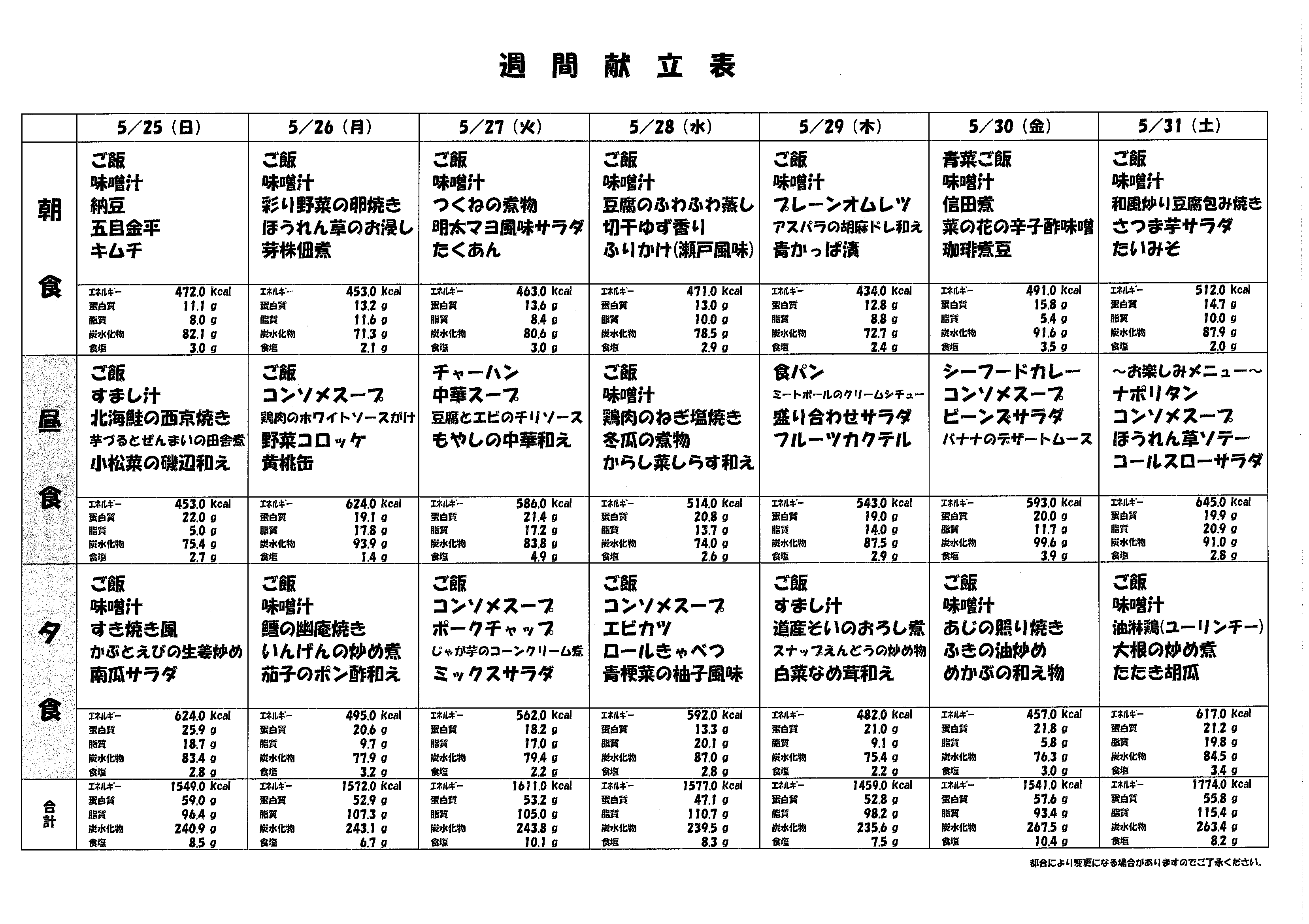 5月献立表